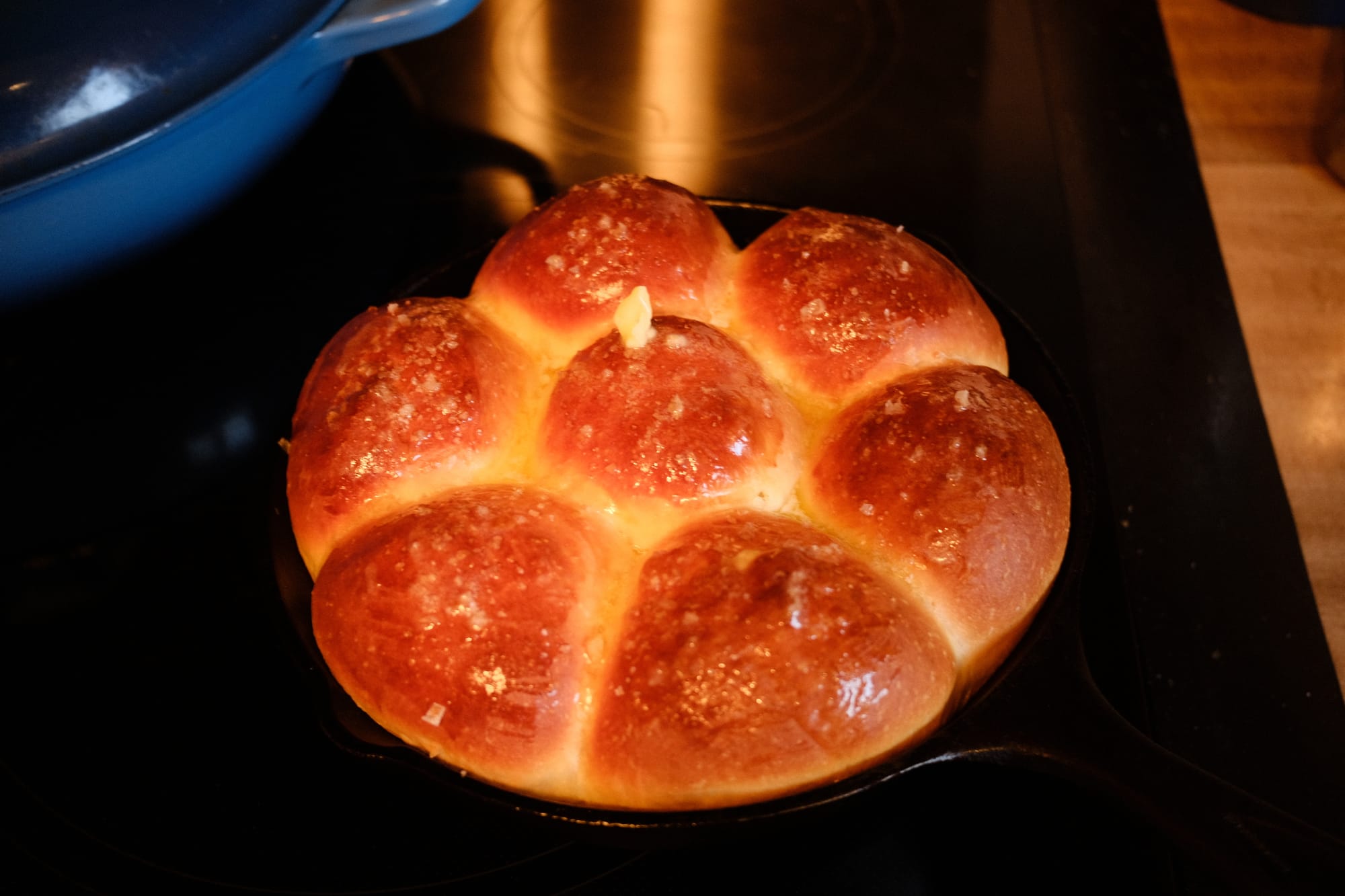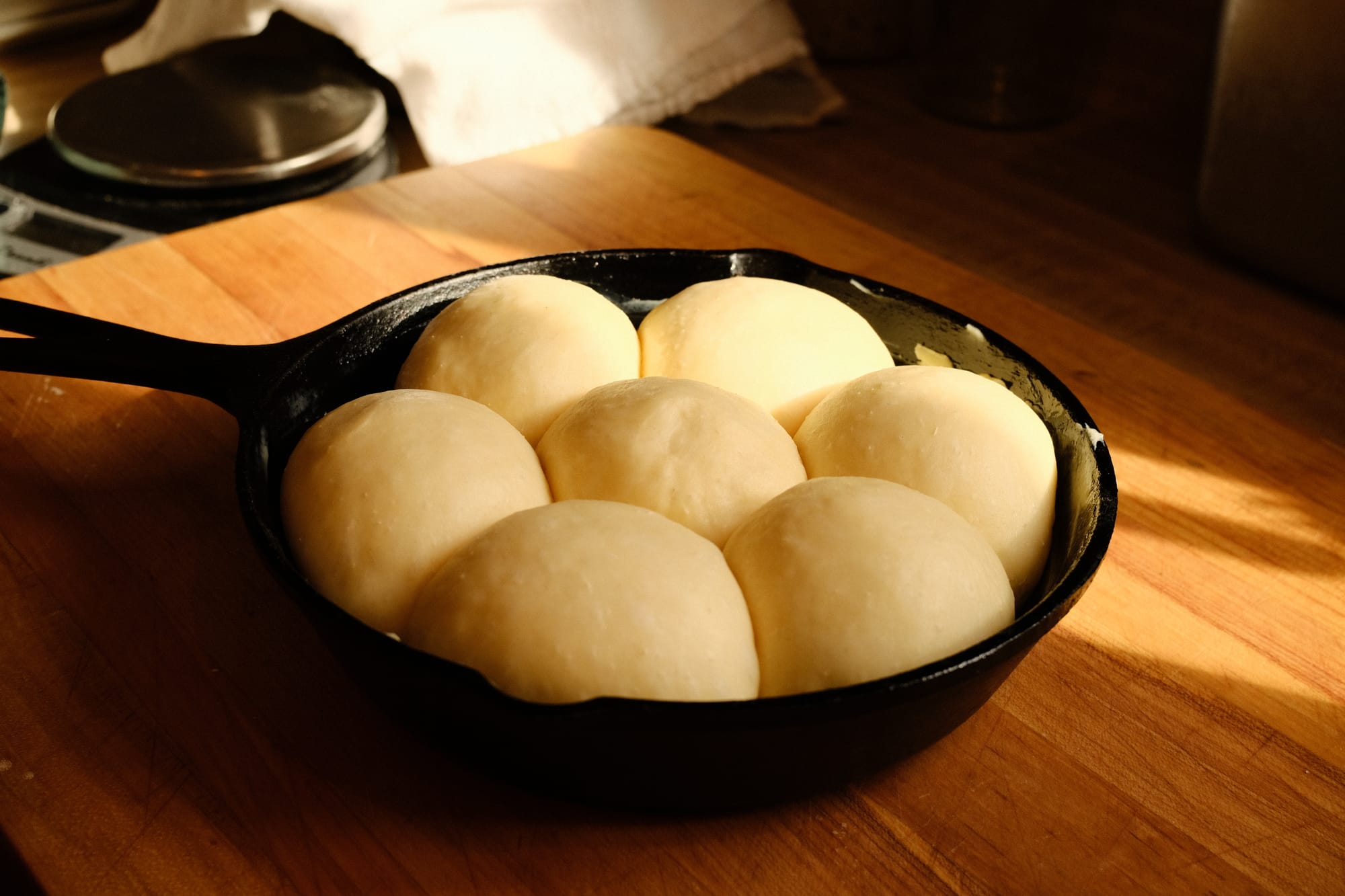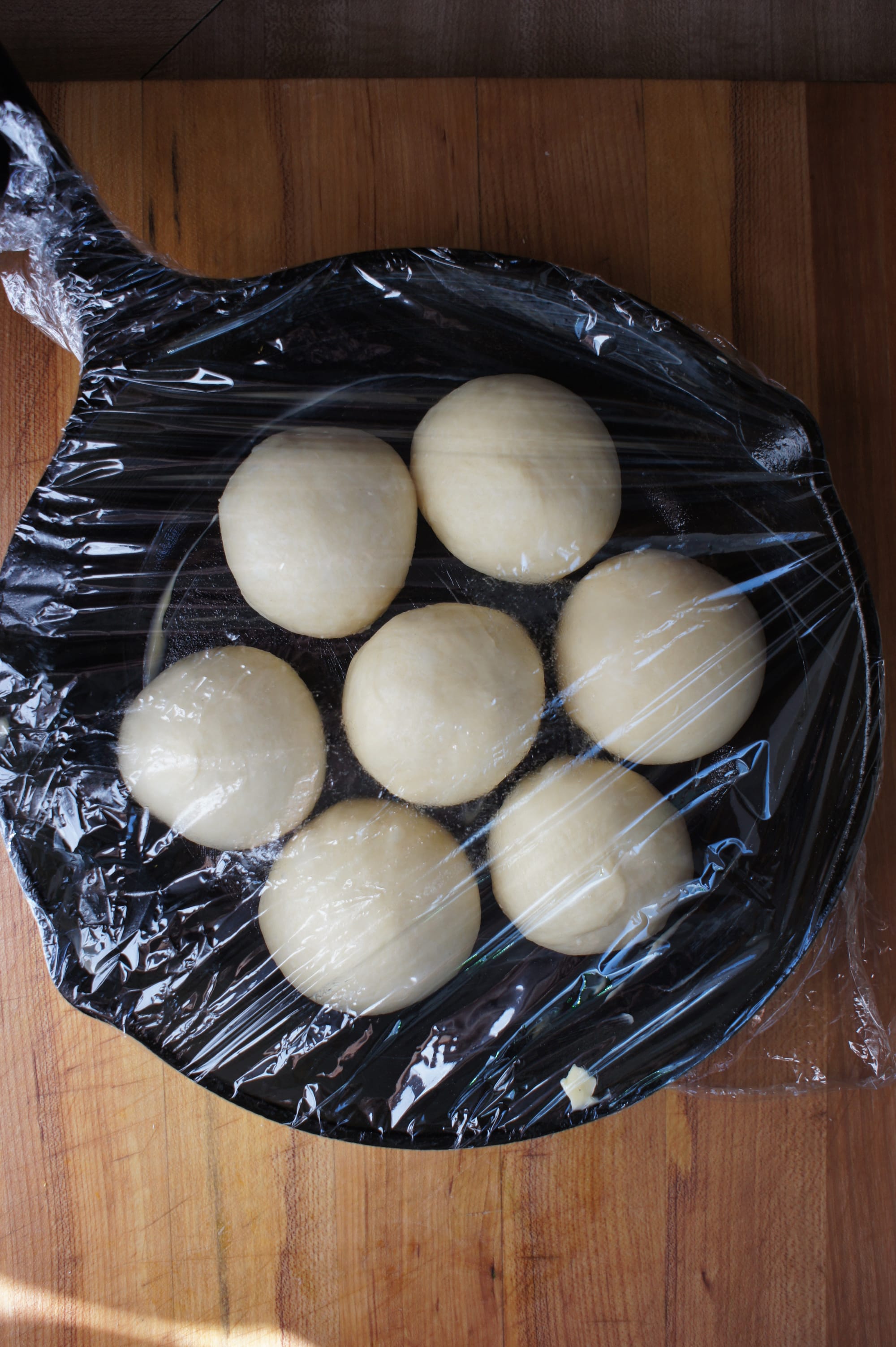- Shape each piece into a tight ball and place in a buttered, 8-inch cast iron pan (6 around and 1 in the center).